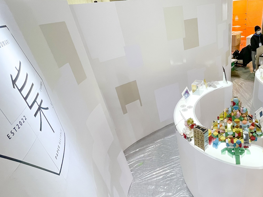 2022年2月15日〜17日にビッグサイトで開催【東京】「インターナショナル・ギフト・ショー春2023」のブース施工を担当いたしました。弊社の担当は湾曲した壁面、湾曲して光る展示台の製作でございます。施工後、A L A K A G R A P H I S様、ATRAPS様によって、さまざま色、素材の用紙を壁面に貼り込み、商品を陳列し、とても素晴らしいブースとなりました。