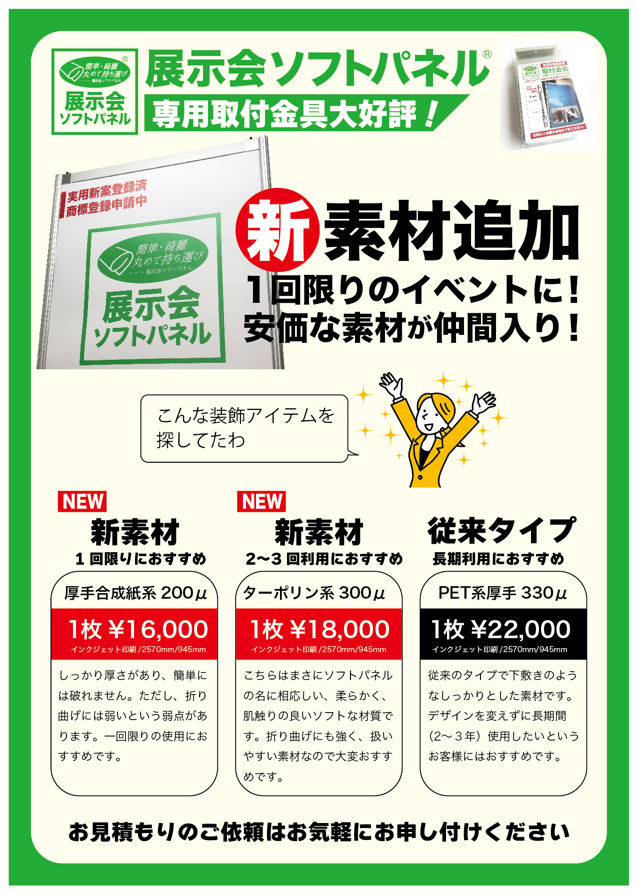 お客様のご要望にお応えして、一回限りのイベントなどに安価なタイプが新登場!ご利用用途に応じて素材を選ぶことができるようになりました!
