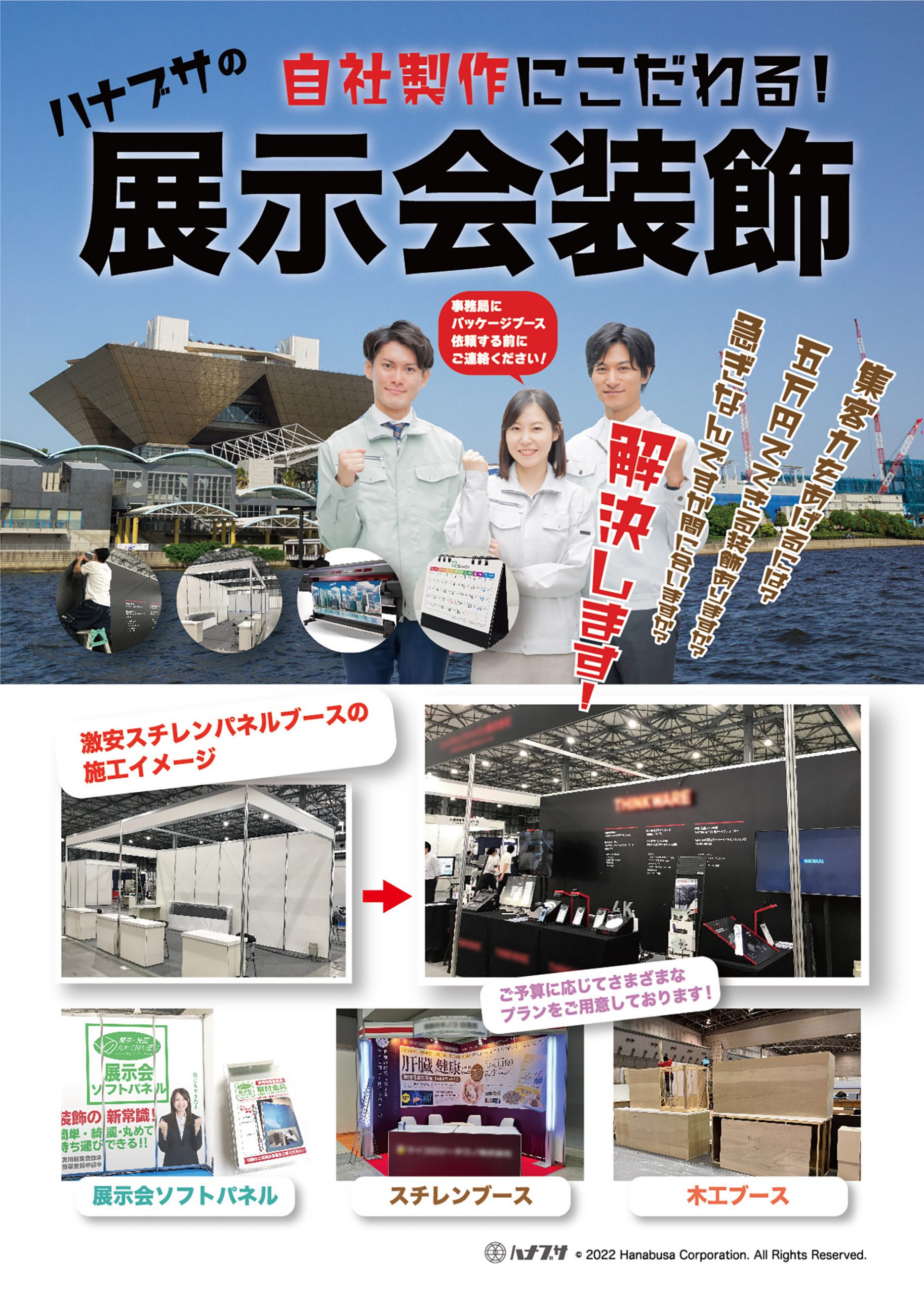 弊社では自社製作にこだわった展示会ブース施工・装飾を行っております。可能な限り自社で製作し、自社で施工することでコストを抑え、他社に負けない価格を実現しております。展示会事務局のパッケージブースを依頼する前に一度ご相談ください!基礎のシステムブースから木工ブースまでご予算に応じた最善のプランをご提案させていただきます。