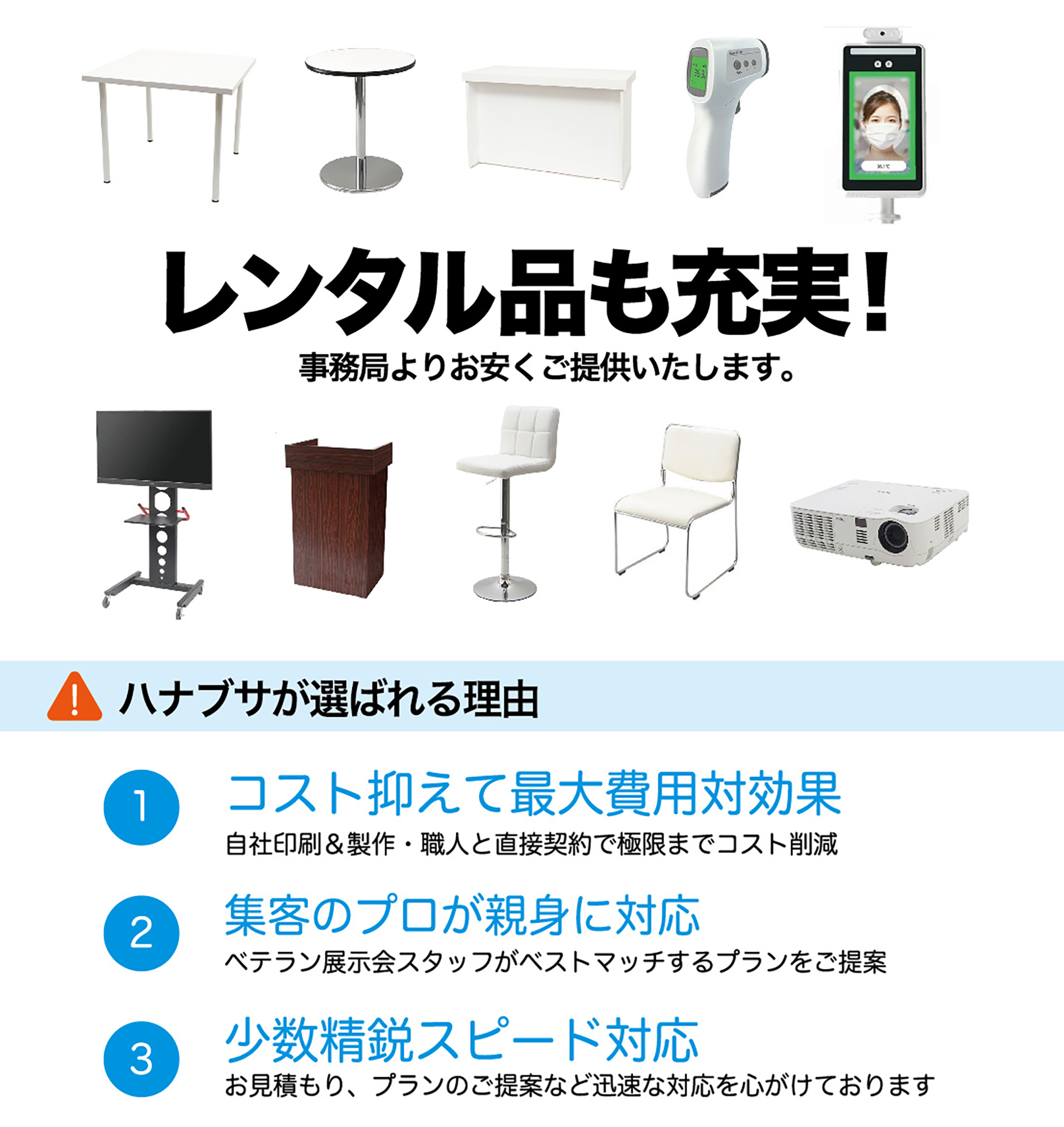 場所を確保するだけでも大きな費用がかかる展示会については、費用はできる限り抑えたいところです。でもせっかくの出展で妥協はしたくない!そんなお客様には当社のサービスがピッタリです。印刷会社が母体である弊社の利点を活かしオリジナルデザインのブースを格安でご提供いたします。